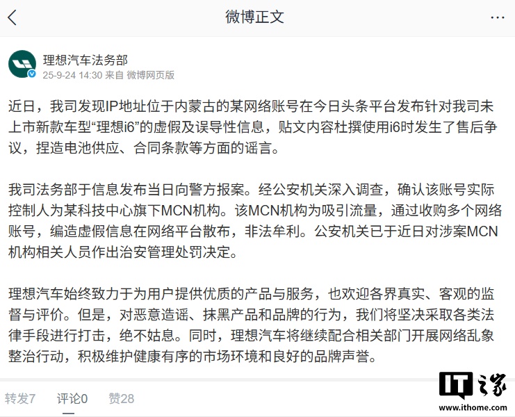近日,我司发现 IP 地址位于内蒙古的某网络账号在今日头条平台发布针对我司未上市新款车型“理想 i6”的虚假及误导性信息,贴文内容杜撰使用 i6 时发生了售后争议,捏造电池供应、合同条款等方面的谣言。
