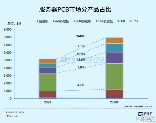 随着AI服务器升级,GPU主板也将逐步升级为HDI,因此HDI将是未来5年增速最快的PCB,根据Prismark预计,2023-2028年HDI的CAGR将达到16.3%,是增速最快的品类。