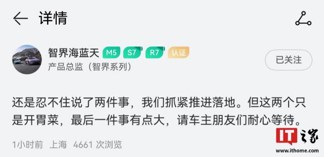 智界系列产品总监 @智界海蓝天 昨日发文称:"对智界的喧嚣已尘埃落地,智界加油,未来可期!"另外,他还表示"本周之后,智界可以全力向前奔跑"。